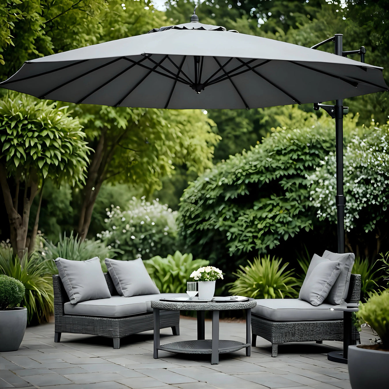 Large garden parasol shading modern outdoor patio furniture on a lush green terrace