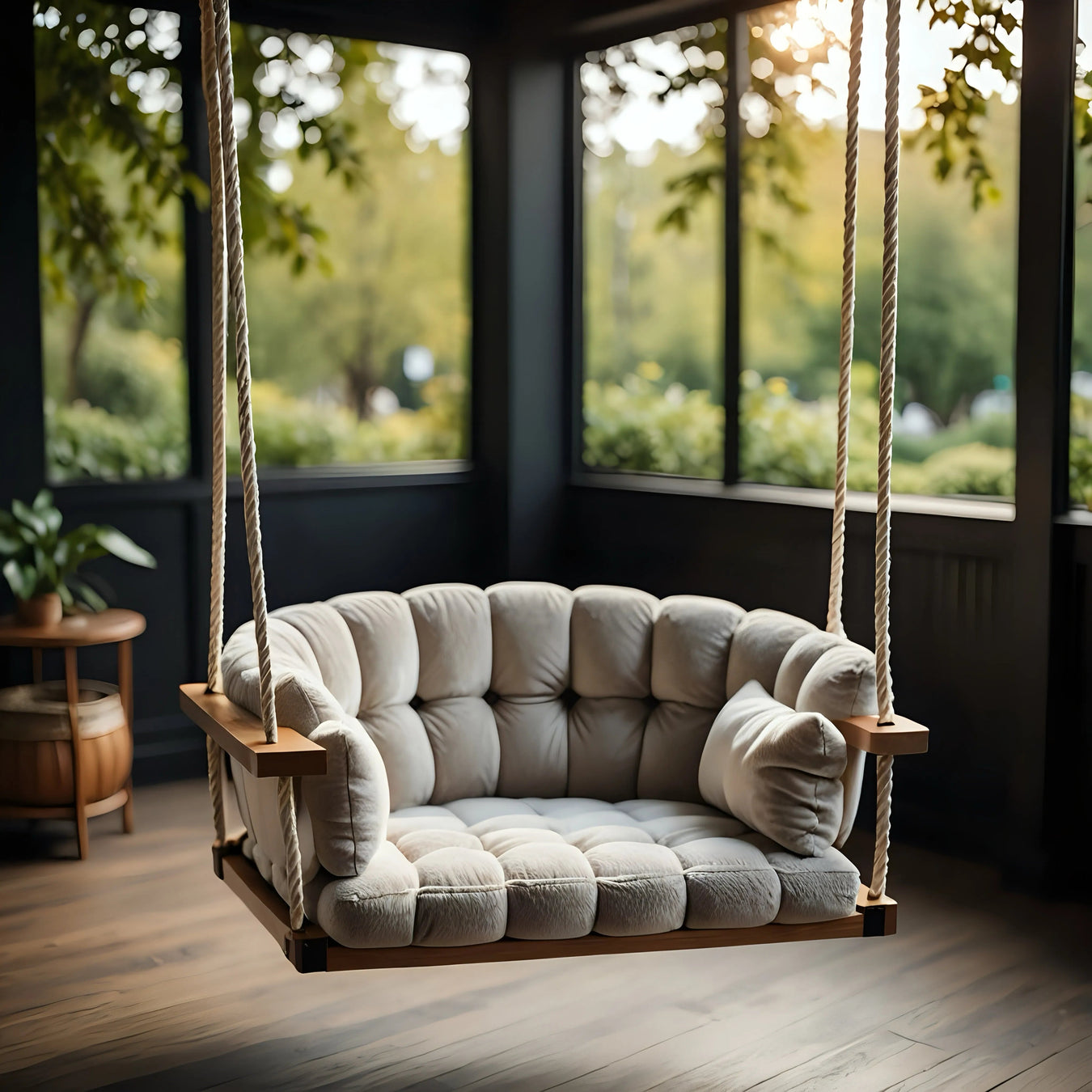 Cushioned garden swing seat indoors with rope supports and large windows, modern decor